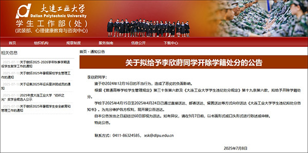 大连工业大学学生工作部(处)网站7月8日发布“关于拟给予李欣莳同学开除学籍处分的公告”。